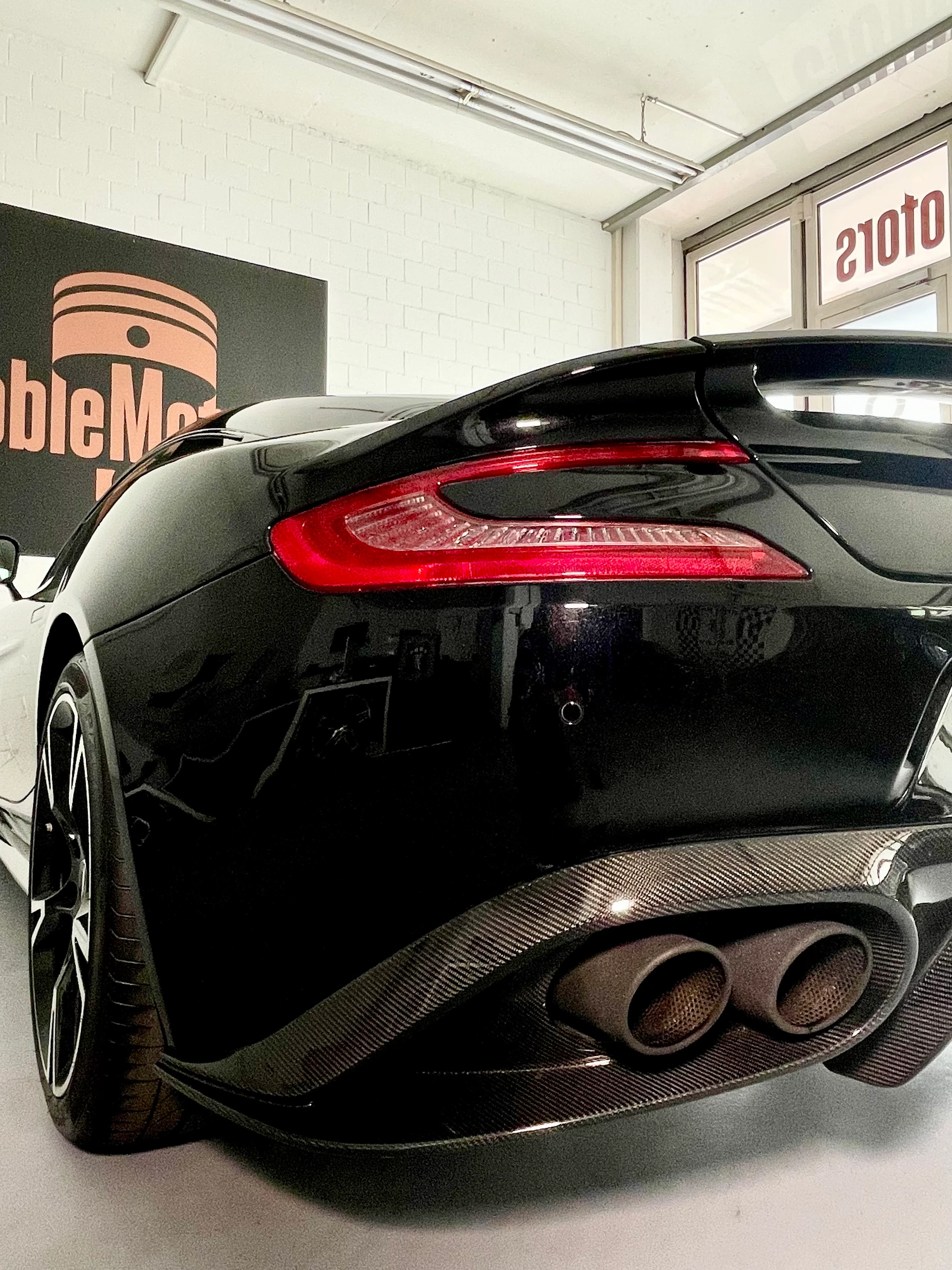 Das Sportcoupé in schwarz / schwarz und alles in Carbon Innen und Aussen überzeugen mit dem satten Sound seinen Auftritt. Auf Wunsch klassisch elegant und souverän oder per Knopfdruck schwarz, breit und mit V12 Sound, welcher Ihre Umgebung erschaudern lässt.